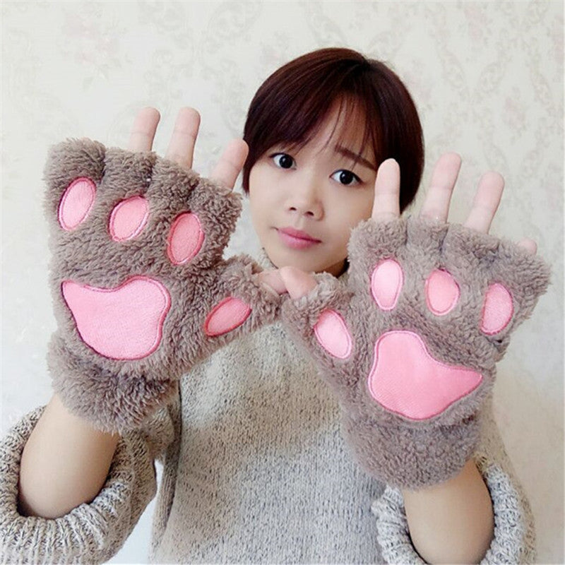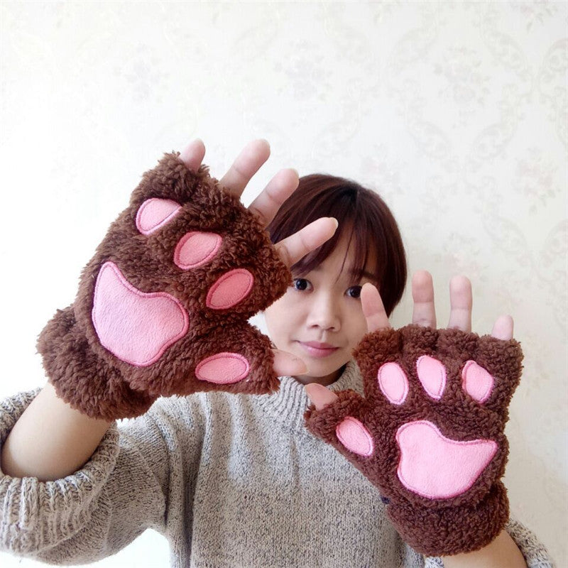 Cute Bear Paw Plush Gloves Winter Warm Knitted Gloves High Quality Half Finger Cartoon Glove For Girl and Women Gift
